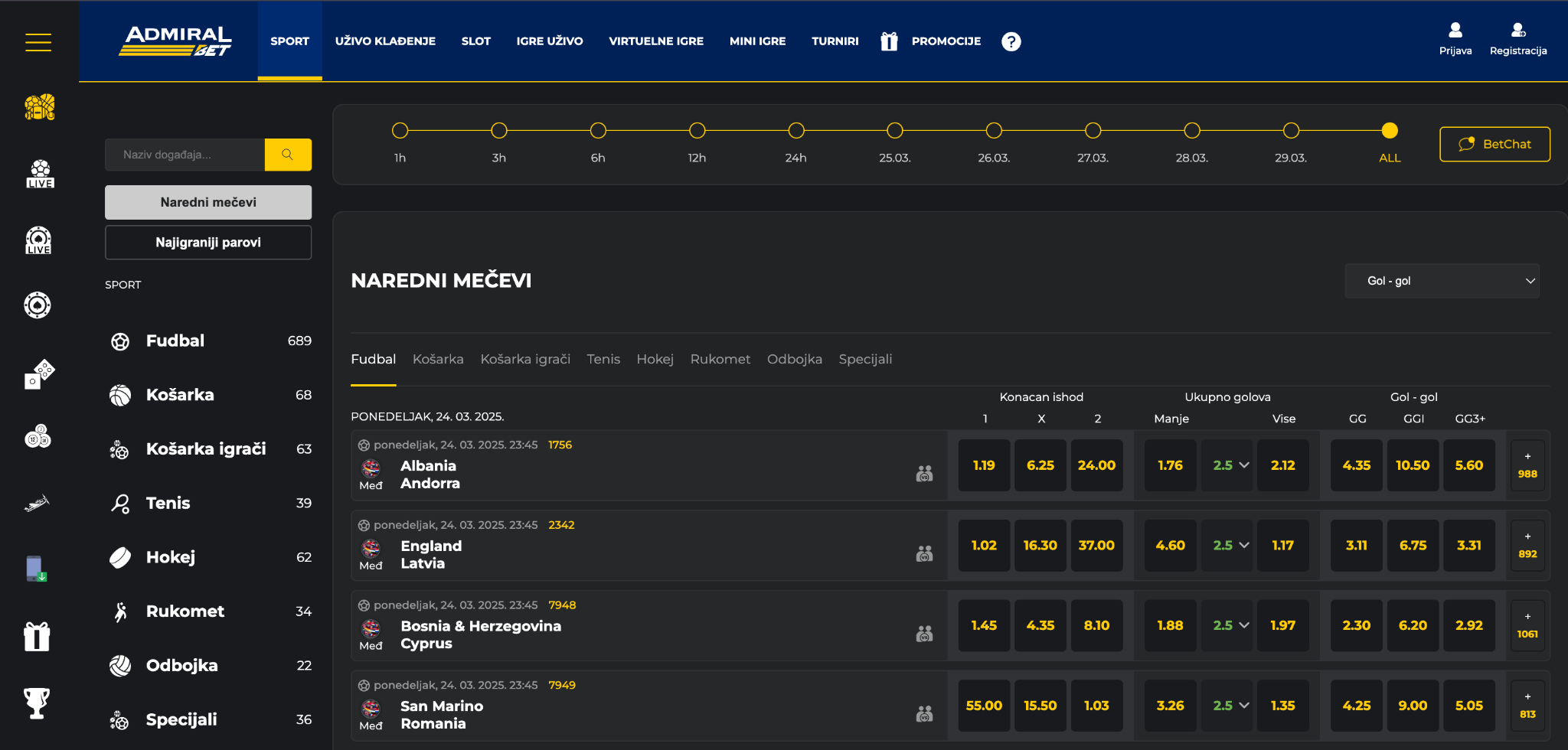 Kvote: Admiral bet kvote su veoma konkurentne za velike događaje – na primer, derbi Partizan-Crvena Zvezda često ima bolje šanse nego kod rivala poput MaxBeta ili Mozzarta, sa prosečnim maržama od 5-6%. Međutim, za manje popularne lige ili niže divizije, kvote mogu biti nešto slabije, što je uobičajeno za većinu kladionica fokusiranih na mainstream sportove.