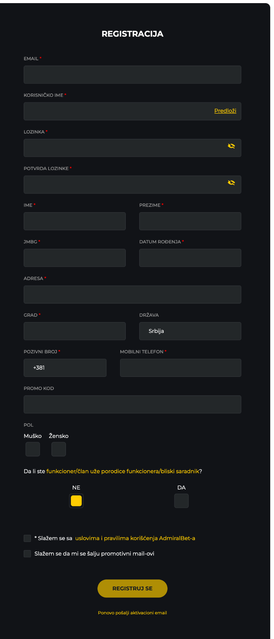 Popunite online formular: unesite osnovne podatke poput imena, prezimena, datuma rođenja, JMBG-a, validne e-mail adrese i kreirajte sigurnu lozinku – preporučujemo kombinaciju slova, brojeva i simbola za maksimalnu zaštitu.