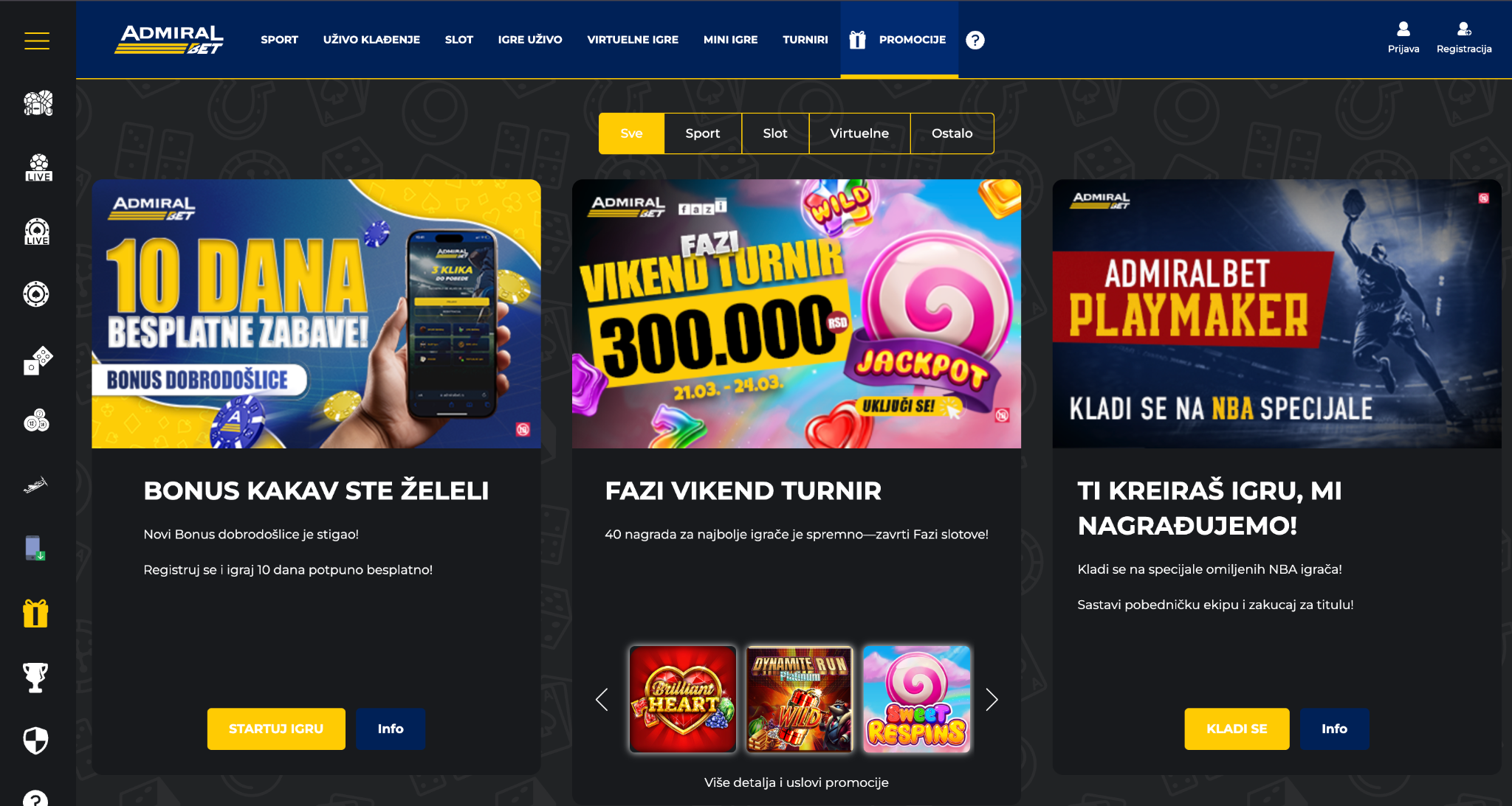 AdmiralBet kladionica i kazino je jedan od najpouzdanijih i najatraktivnijih izbora za igrače u Srbiji, nudeći kombinaciju bogate ponude sportskog klađenja, primamljivih kazino igara i velikodušnih bonusa poput admiralbet bonus dobrodoslice. Mobilna aplikacija (admiral bet aplikacija), odlična korisnička podrška i fokus na sigurnost čine ga liderom na tržištu, iako metode plaćanja i kvote za manje sportove imaju prostora za unapređenje. Bilo da ste u admiral bet beograd poslovnici ili igrate online preko admiralbet rs, ova platforma pruža sve što je potrebno za vrhunsko iskustvo – od uzbuđenja live klađenja do šansi za džekpot na slotovima. Registrujte se danas i uverite se zašto je admiral bet omiljen među srpskim igračima!