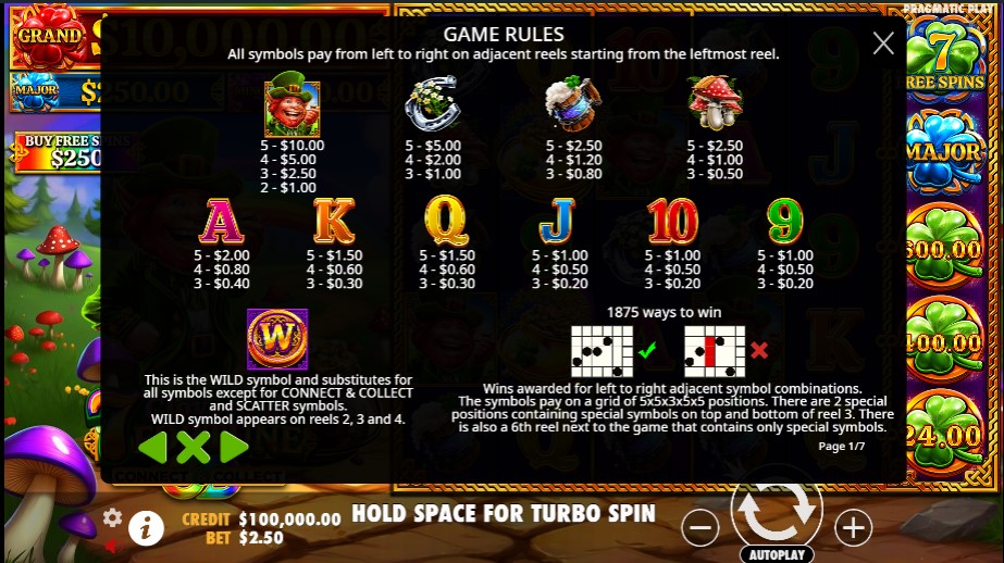 7 Clovers of Fortune online prenosi igrače u irski svet ispunjen dugama, zlatnim ćupovima i veselim leprekonima. Iako je irska tematika česta u slot industriji, Pragmatic Play je uspeo da je osveži kroz detaljnu grafiku i pažljivo osmišljenu zvučnu podlogu. Pozadina igre prikazuje zelene brežuljke i duge, dok simboli uključuju potkovice, pečurke, pivo, deteline i leprekona. Svetlosni efekti naglašavaju dobitne kombinacije i Connect & Collect aktivacije, dok tradicionalna irska muzika, upotpunjena animiranim zvučnim efektima, stvara svečanu atmosferu. Ova kombinacija vizuelnih i zvučnih elemenata čini igru prijatnom za duže sesije, bez zamora za oči ili uši.
