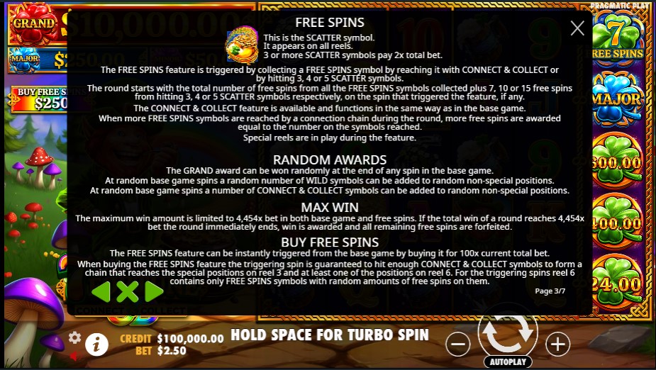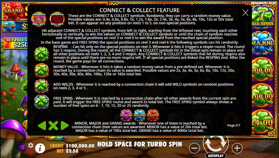 7 Clovers of Fortune slot izdvaja se po raznovrsnim bonusima i Connect & Collect mehanizmu. Respins funkcija donosi 5 zaključanih spinova, dok Money Value nagrade isplaćuju od 2x do 160x uloga. Add Wilds nasumično postavlja wild simbole na rilove 2–5, a besplatni spinovi (7, 10, 15, 20 ili 25) aktiviraju se scatter simbolom (ćup zlata) uz dodatnu novčanu nagradu od 2x. Džekpotovi uključuju Minor (20x), Major (100x) i Grand (4.000x). Tokom besplatnih spinova, sve Connect & Collect funkcije ostaju aktivne, povećavajući šanse za dobitke.