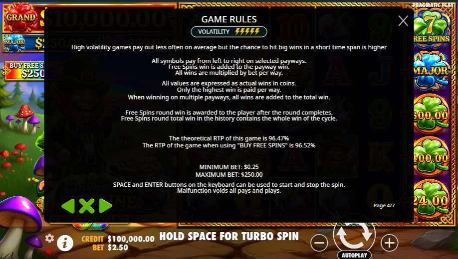 7 Clovers of Fortune free ima RTP od 96,47%, što je iznad proseka industrije. Visoka volatilnost znači ređe dobitke, ali sa potencijalom za značajne isplate, do 4.454x uloga. Ova karakteristika privlači igrače koji uživaju u većem riziku radi mogućnosti velikih nagrada. Matematička osnova igre osigurava fer iskustvo, uz potencijal za dobitke veće od 1.000.000 € pri maksimalnom ulogu.