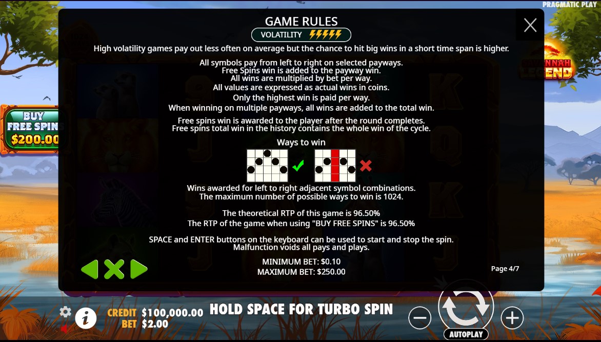 Savannah Legend koristi format 5 rilova i 4 reda bez klasičnih linija; nagrađuje se svaka kombinacija od tri ili više identičnih simbola na susednim rilovima s leva nadesno. Standardne opcije Autoplay i Turbo Spin ubrzavaju tok igre, dok Feature Buy (100 × ulog) omogućuje trenutni pristup bonusu.