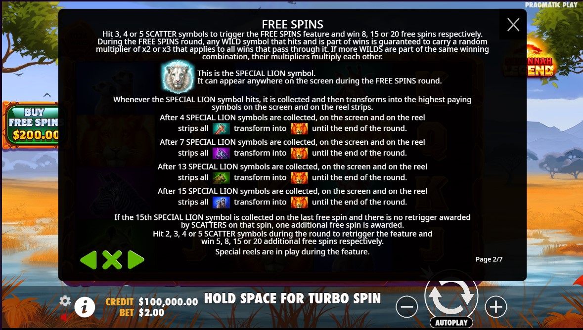 Još jedna važna karakteristika je simbol belog lava, koji se pojavljuje isključivo tokom besplatnih spinova. Svaki put kada se pojavi, dodaje se u metar i aktivira transformacije simbola drugih životinja u lavove, koji su najvredniji simboli u igri. Kada se sakupe četiri bela lava, žirafe postaju lavovi. Sa sedam belih lavova, lavovima se pridružuju i zebre. Na trinaestoj pojavi belog lava, hijene se takođe transformišu, a kada se prikupi ukupno petnaest, poslednja grupa – surikate – menja svoj oblik u najjače simbole. Ukoliko se petnaesti lav pojavi na poslednjem spinu, a dodatni scatter ne pokrene novu rundu, igrač dobija jedan dodatni spin kao poslednju šansu za uvećanje dobitka.